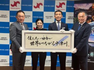 令和8年3月31日に決定発表会を実施しました。小栗仁志中津川市長、早川正人中津川北商工会長にお越しいただき、当所 齊藤会頭とともにキャッチフレーズの発表を行いました。