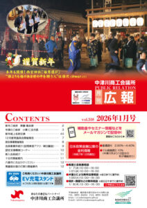 月刊広報 Vol.518 2026年1月 2025.12.31 p.2 新年ご挨拶 齊藤 隆会頭 p.3 年頭のご挨拶 小栗 仁志市長 p.4-6 新年紙上名刺交換 p.7 12月度常議員会開催報告 p.8 部会事業開催報告 p.9 会員事業所紹介(訪問美容アクリ/朝日醸造) p.10 認定支援機関コーナー p.11 新入会員紹介 p.11 十日市開催案内 p.12 六斎市にお出かけください p.12 馬籠宿氷雪の灯祭り開催案内 『十日えびす大祭』開催のご案内